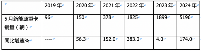 根據(jù)終端上牌數(shù)據(jù),2024年5月新能源重卡銷售5196輛,同比大漲174%,環(huán)比增長(zhǎng)13%。