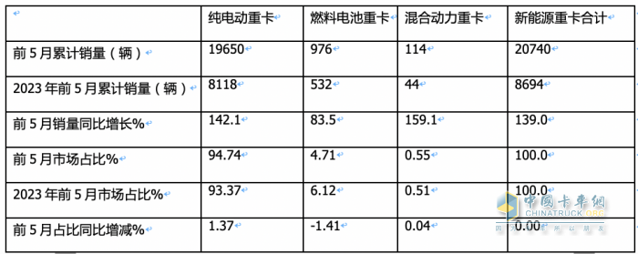 總之,在今年前5月新能源重卡市場(chǎng)中,純電動(dòng)主體地位同比增強(qiáng)。