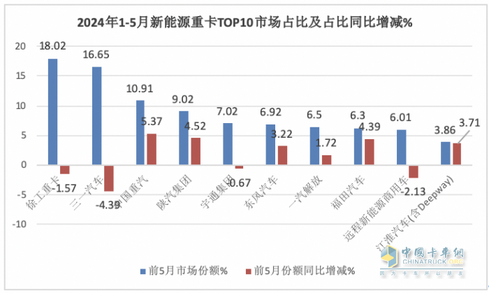 2、在2024年1-5月新能源重卡銷量同比及市場(chǎng)份額、市場(chǎng)份額同比增減中:
