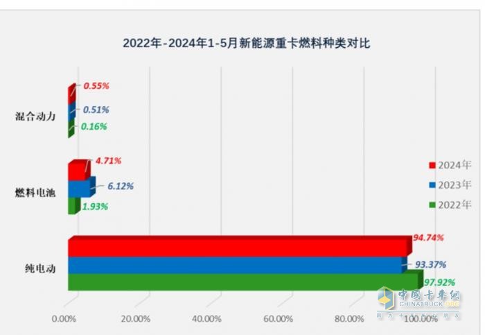 截圖1,2024年1-5月與近年各技術(shù)路線新能源重卡車型銷量占比比較(數(shù)據(jù)來(lái)源:公開的終端上牌信息)