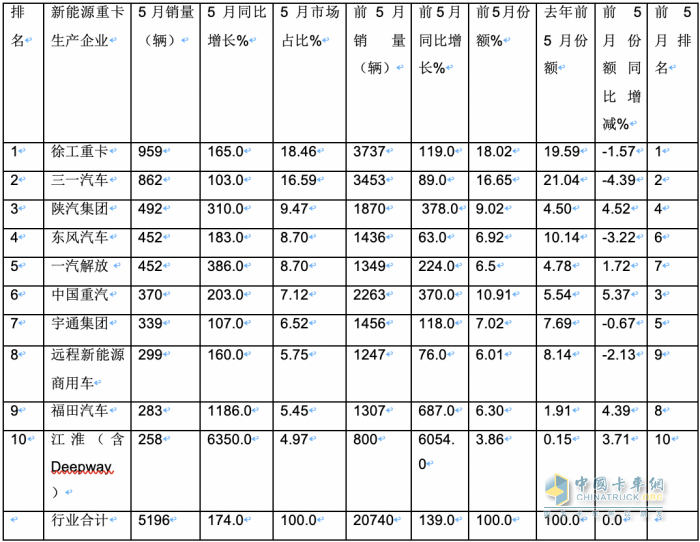 特點(diǎn)四:5月:徐工奪冠,三一陜汽分列二三,TOP10同比均增長(zhǎng),福田江淮領(lǐng)漲;