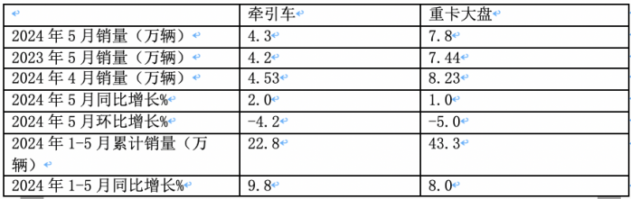 表1,根據(jù)中汽協(xié)數(shù)據(jù),2024年5月?tīng)恳囦N量同環(huán)比與重卡大盤比較:![]()