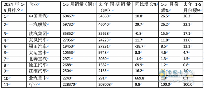 另外,2024年1-5月?tīng)恳嚴(yán)塾?jì)同比增長(zhǎng)9.8%,跑贏2024年1-5月重卡大盤8%的累計(jì)同比增速近1.8個(gè)百分點(diǎn)。