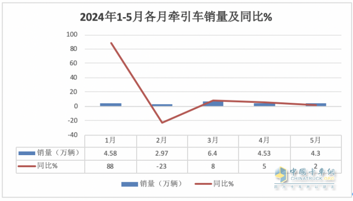 2024年5月?tīng)恳囦N售4.3萬(wàn)輛,在近5年同期中居第三,雖然排名第三,居于中等,但與2020年5月的9.08萬(wàn)輛及2021年5月的8.25萬(wàn)輛相差甚遠(yuǎn),屬于較低水平,說(shuō)明今年5月的牽引車市場(chǎng)需求動(dòng)力仍顯不足;