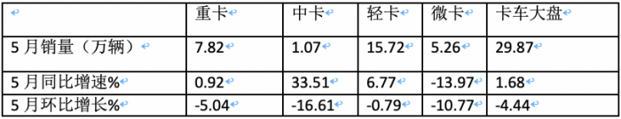 表1,根據(jù)中汽協(xié)數(shù)據(jù),2024年5月輕卡銷量同環(huán)比與卡車大盤(pán)比較:![]()