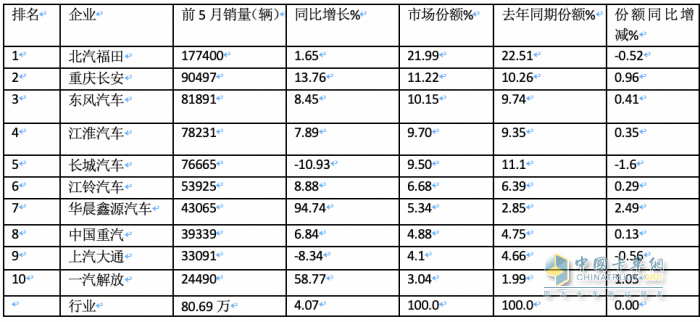 特點(diǎn)六、前5月累銷:福田長(zhǎng)安東風(fēng)居前三;TOP10同比8增2降,鑫源領(lǐng)漲;市場(chǎng)份額同比7增3減,鑫源增加最多