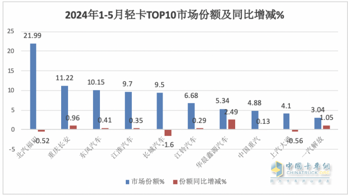 上圖表可見(jiàn),在2024年前5月,輕卡TOP10市場(chǎng)份額及份額同比增減: