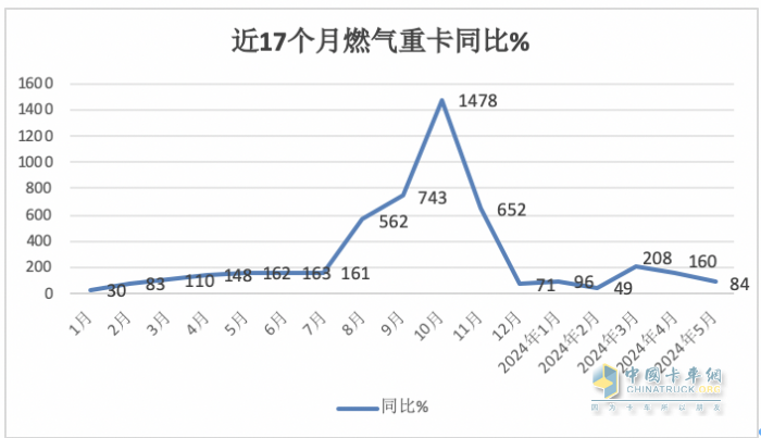2024年5月燃氣重卡銷量同比增長84%,至此,構(gòu)成了從去年1月開始的“17連漲”,這種現(xiàn)象在近年燃氣重卡發(fā)展史上是絕無僅有的,因此成為今年5月燃氣重卡市場的一個顯著特點。
