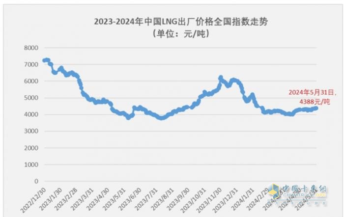 從截圖1可知,在去年12月,LNG出廠價格大約在6000元/噸左右,這時的燃氣重卡優(yōu)勢不明顯;到了2024年1月,LNG價格下降到5300元/噸左右;接下來的2月,LNG出廠價格繼續(xù)下探(月平均價格大約在4400元/噸),3月LNG出廠價格在2月的基礎(chǔ)上繼續(xù)下降到4100多元/噸,這時的“油氣”價差更大,進入今年4月份和5月,燃氣價格也一直在4000多元/噸,且一直比較平穩(wěn),雖然5月底燃氣價格略有回升,但仍然處在“友好”的價格區(qū)間,因此導(dǎo)致燃氣重卡成本優(yōu)勢一直比較突出。