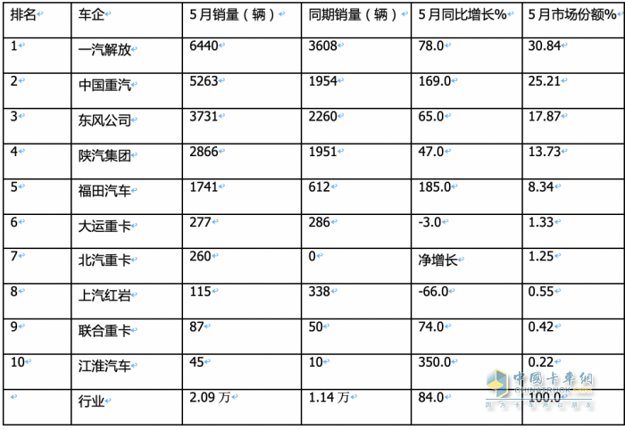 ---一汽解放銷6440輛,也是唯一銷量超6000輛的車企,同比增長78%,市場份額為30.84%,強勢奪冠;