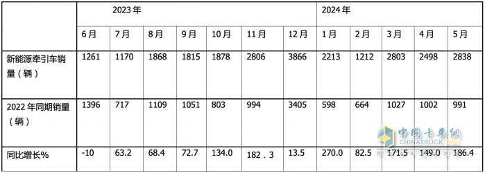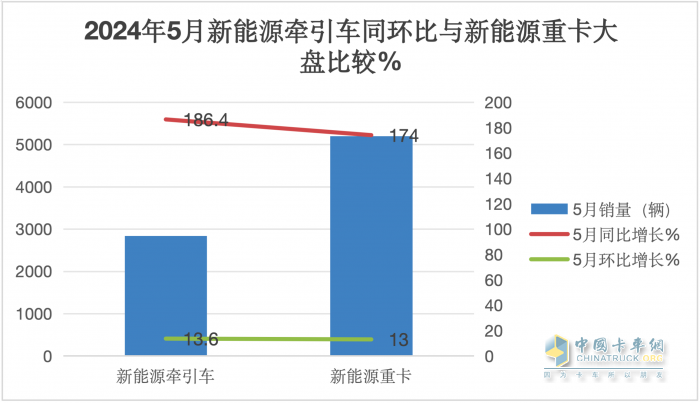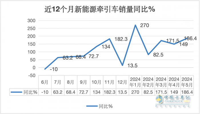 ---2024年5月新能源牽引車同比增長186.4%,跑贏2024年5月新能源重卡整體終端市場174%的增幅近12.4個百分點;