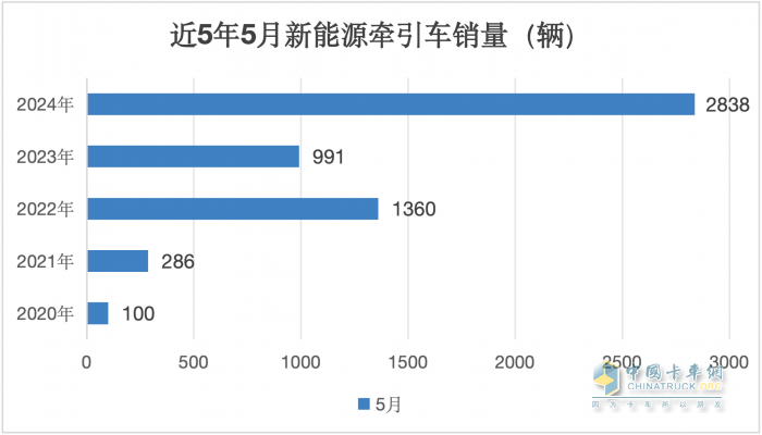 根據(jù)終端上牌數(shù)據(jù),2024年5月新能源牽引車銷售2838輛,同比去年5月的991輛大漲近1.86倍(186.4%),環(huán)比今年4月的2498輛增長13.6%??梢娊衲?月新能源牽引車銷量實現(xiàn)了同環(huán)比雙增的良好發(fā)展態(tài)勢。