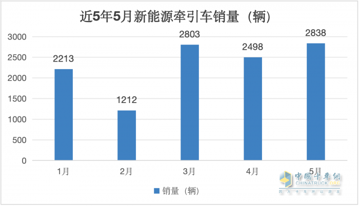 根據(jù)終端上牌信息,近5年5月新能源牽引車銷量統(tǒng)計如下:![]()