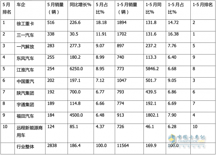 特點五:5月:徐工奪冠,三一/解放分列二三;前5月:三一、徐工、重汽居前三
