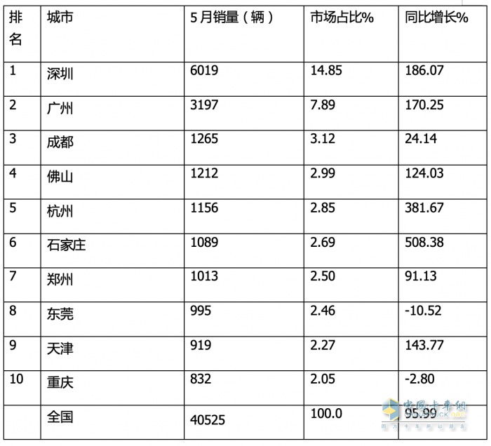 ---成都重回第三,5月銷1265輛。銷量最好車型有解放J6F、遠程星智H、開瑞小象,市場占比為3.12%;