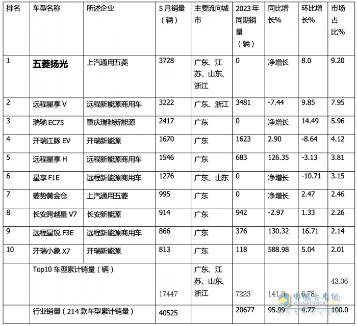 一、 暢銷車型中,五菱揚光奪冠,遠程星享v和瑞馳C75分列二三;TOP10同比8增2降;環(huán)比7增3降;TOP10累計占比超4成