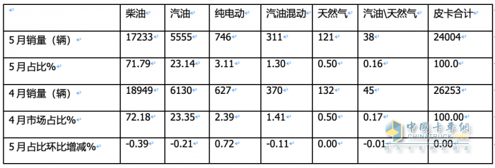 一、5月國內(nèi)皮卡:按動力燃料種類劃分,柴油皮卡占主體,但銷量環(huán)比下降;純電動占比環(huán)比增加最多