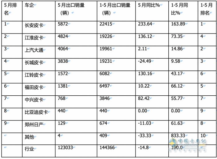 上表顯示,在2024年5月及1-5月皮卡出口車企排行中: