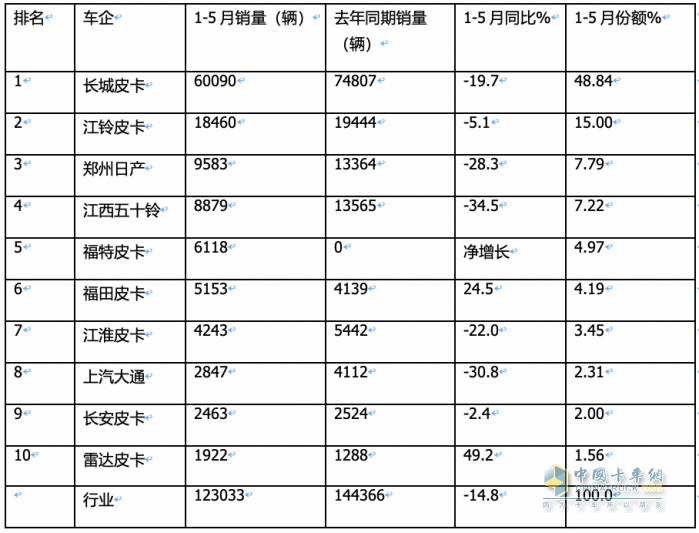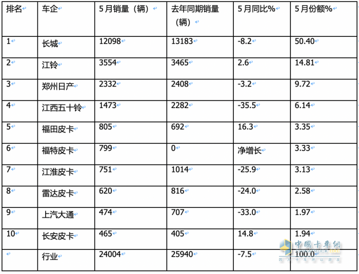 二、5月國內(nèi)皮卡:長城居榜首;江鈴鄭州日產(chǎn)分列二三;TOP10同比6降4增;福田領(lǐng)漲
