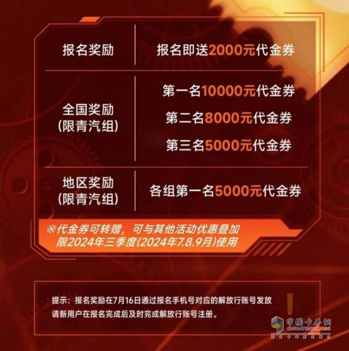 為保障賽事成績的真實可靠,參賽車輛在活動期間運營里程牽引至少3000公里、載貨至少2000公里。油耗氣耗,牽引柴油車百公里油耗≥24升、牽引燃氣車百公里氣耗≥24公斤、載貨柴油車百公里油耗≥12升。青汽組以解放行APP行車數(shù)據(jù)作為排名依據(jù),滿足上述條件方可參與排名,贏取賽事的豐厚獎品。