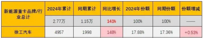 2024年1-6月,徐工新能源重卡累銷再得行業(yè)第一,同比大漲148%繼續(xù)跑贏重卡市場“大盤”!