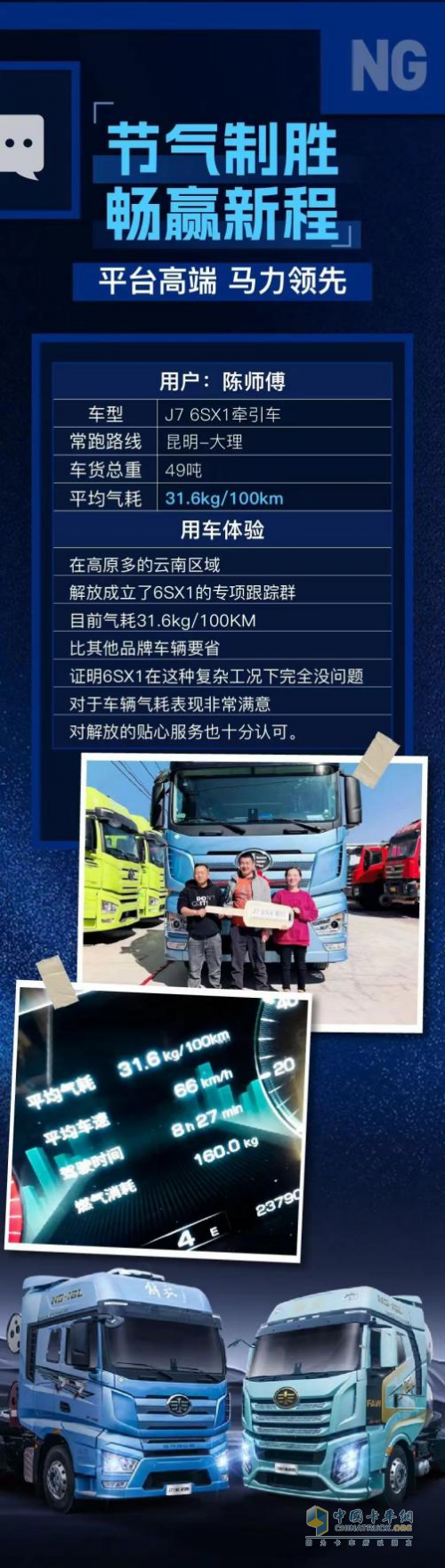 云南用戶陳師傅,常年往返昆明和大理兩地,從事百貨運(yùn)輸。之前他駕駛的是J7燃油車,今年過(guò)年期間換成了J7燃?xì)廛?。最讓他津津?lè)道的就是這款車的氣耗:車輛搭載CA6SX1發(fā)動(dòng)機(jī),16L超大排量,600馬力傲視群雄,起步瞬間即刻爆發(fā),超車、爬坡一騎絕塵。車輛在3000米山區(qū)動(dòng)力不減,5000米高原亦能輕松應(yīng)對(duì)。為了在業(yè)內(nèi)樹(shù)立高效節(jié)能新標(biāo)桿,一汽解放在高原多的云南地區(qū)成立了CA6SX1專項(xiàng)“跟蹤小組”,檢測(cè)產(chǎn)品的節(jié)氣效果。巔峰動(dòng)力證明,CA6SX1發(fā)動(dòng)機(jī)綜合熱效率首破40%,綜合傳動(dòng)效率超越行業(yè)3%,每一分氣耗都精打細(xì)算,即使在高原復(fù)雜工況下也完全沒(méi)有問(wèn)題。陳師傅當(dāng)前車貨總重約49噸,平均氣耗為31.6kg/100km,較其他品牌車輛都要省。陳師傅說(shuō)J7各方面都十分滿意,值得推薦。