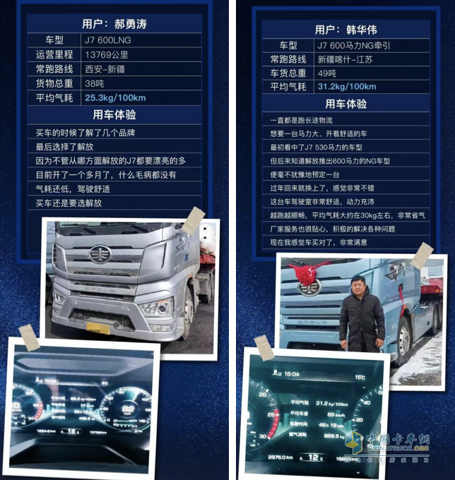來自西安的郝勇濤師傅從事的是快遞運輸,從西安到新疆,駕駛J7 600馬力LNG牽引車運營一個多月下來,累計行駛1.3萬公里,貨物總重38噸上下,平均氣耗僅為25.3kg/100km。J7的密封性出色以及氣耗表現(xiàn)贏得了郝師傅的高度認可,他說:“目前沒遇到任何問題,60邁車速下長坡、陡坡都輕松。買車還是選解放!”