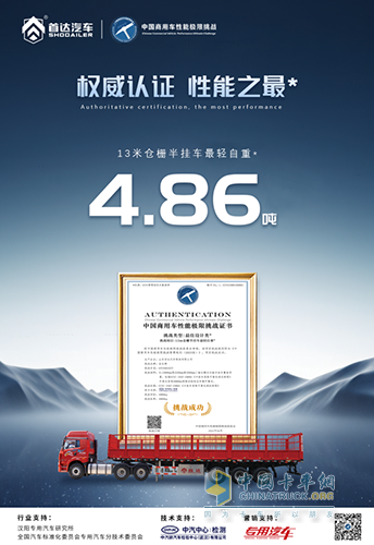 中國商用車性能極限挑戰(zhàn)組委會現(xiàn)場宣布,首達(dá)汽車的13米倉柵半掛車在“13米倉柵半掛車自重極限挑戰(zhàn)”項目中挑戰(zhàn)成功!