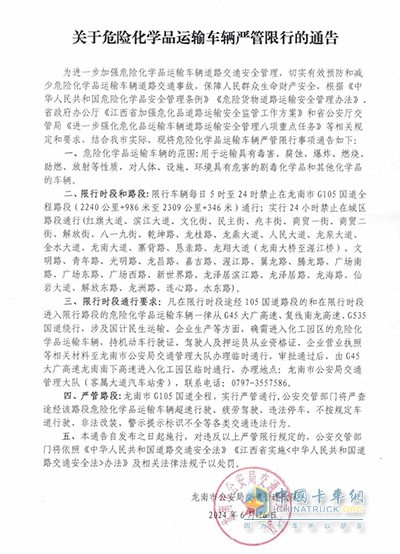 龍南市G105國道全程,實(shí)行嚴(yán)管通行,公安交管部門將嚴(yán)查途經(jīng)該路段危險(xiǎn)化學(xué)品運(yùn)輸車輛超速行駛、疲勞駕駛、違法停車、不按規(guī)定車道行駛、非法改裝、警示提示標(biāo)識(shí)不全等各類交通違法行為。