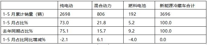 表2,根據(jù)終端上牌數(shù)據(jù),2024年1-5月各類技術(shù)路線新能源冷藏車銷量同比、占比及占比同比增減%