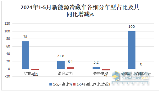 上圖表可見,在2024年1-5月各類新能源冷藏車銷量同比及占比中: