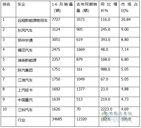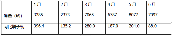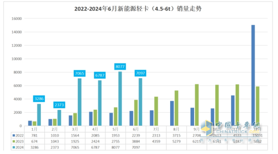 上表顯示,今年6月新能源輕卡銷售7097輛,居今年1-6月各月第二,