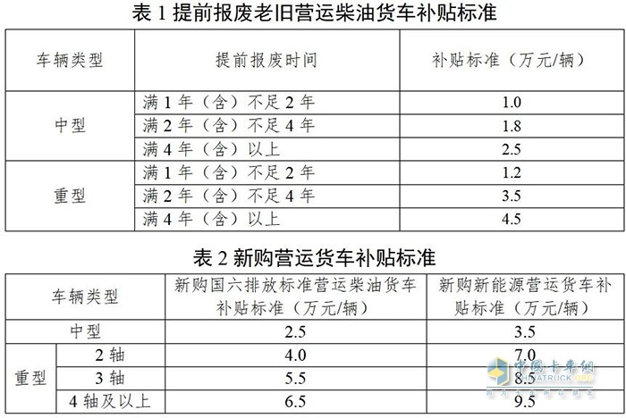 此次補(bǔ)貼范圍明確支持報(bào)廢國(guó)三及以下排放標(biāo)準(zhǔn)營(yíng)運(yùn)類柴油貨車,加快更新高標(biāo)準(zhǔn)低排放貨車。提前報(bào)廢國(guó)三及以下排放標(biāo)準(zhǔn)營(yíng)運(yùn)柴油貨車、提前報(bào)廢并新購(gòu)國(guó)六排放標(biāo)準(zhǔn)貨車或新能源貨車、僅新購(gòu)符合條件的新能源貨車,將分檔予以補(bǔ)貼。但已獲中央其他資金渠道支持的車輛不在此次補(bǔ)貼之列,補(bǔ)貼政策實(shí)施期限截至2024年12月31日。