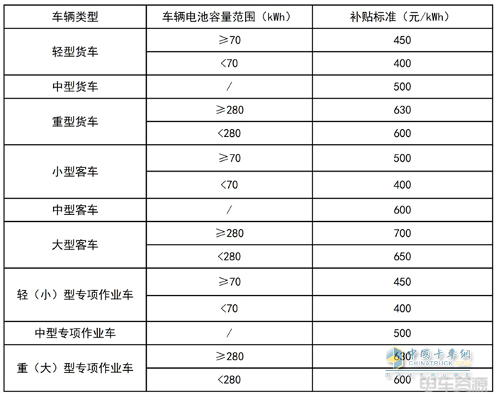 注:1.車輛類型按照《道路交通管理機(jī)動車類型》(GA802-2019)確定;“-”表示不予補(bǔ)貼。2.新能源車輛更新補(bǔ)貼金額依據(jù)新能源車輛類型、電池容量、退坡比例確定,具體標(biāo)準(zhǔn)見表2。新能源車輛類型為報廢國四柴油車同類型或更小類型的,按照購買的新能源車輛類型補(bǔ)貼;新能源車輛類型為報廢國四柴油車更大類型的,按照報廢車輛類型補(bǔ)貼。2026年1月1日以后購置的,實(shí)際補(bǔ)貼金額=補(bǔ)貼標(biāo)準(zhǔn)×80%,退坡比例為20%。表2上海市國四柴油車新能源化更新補(bǔ)貼標(biāo)準(zhǔn)注:1.車輛類型按照《道路交通管理機(jī)動車類型》(GA802-2019)確定;2.“/”表示該類車型執(zhí)行統(tǒng)一補(bǔ)貼標(biāo)準(zhǔn),不再根據(jù)電池容量進(jìn)行細(xì)分;3.車輛電池容量根據(jù)申請補(bǔ)貼車輛車型公告數(shù)值確定;4.貨車類型分級由大到小分別為重型、中型、輕型;客車類型分級由大到小分別為大型、中型、小型;專項(xiàng)作業(yè)車類型分級由大到小分別為重(大)型、中型、輕(小)型。