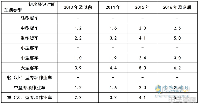1.國四柴油車淘汰補(bǔ)貼金額依據(jù)柴油車的車輛類型、初次登記年限和退坡比例確定,具體標(biāo)準(zhǔn)見表1。2026年1月1日以后報廢的,實(shí)際補(bǔ)貼金額=補(bǔ)貼標(biāo)準(zhǔn)×80%,退坡比例為20%。表1上海市國四柴油車淘汰補(bǔ)貼標(biāo)準(zhǔn)(單位:萬元)