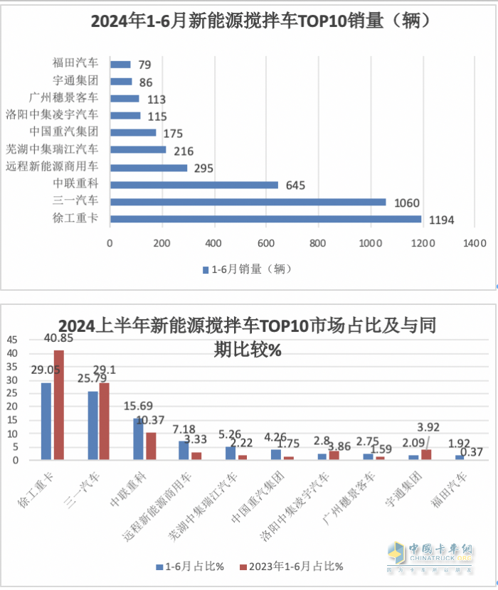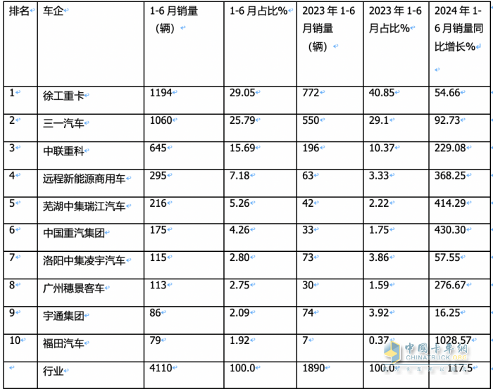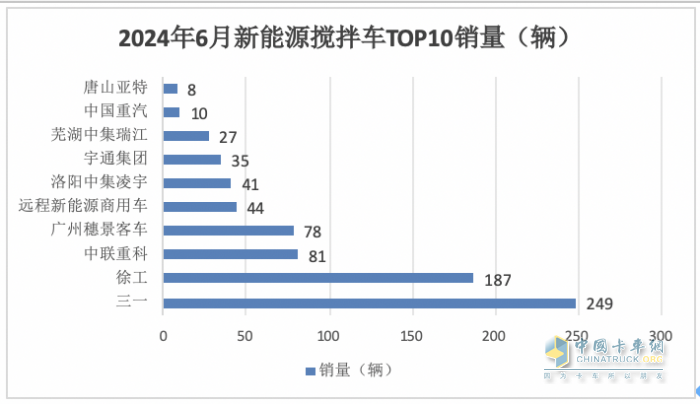 上圖顯示,在2024年6月新能源攪拌車銷量TOP10中: