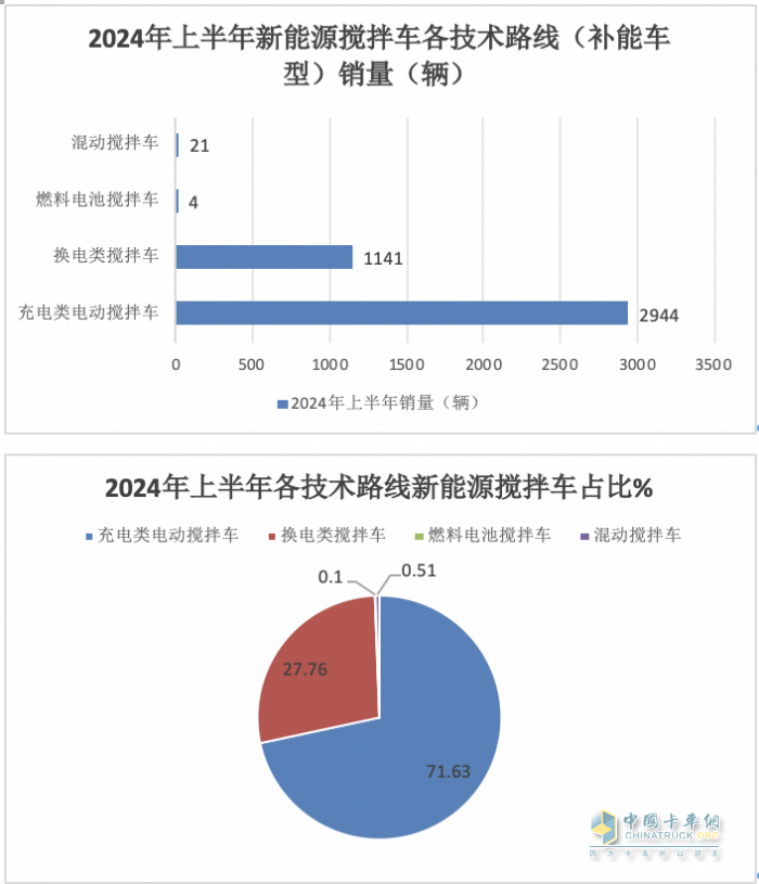 上圖可見,按技術(shù)路線及補電方式劃分,在今年1-6月新能源攪拌車銷量結(jié)構(gòu)中: