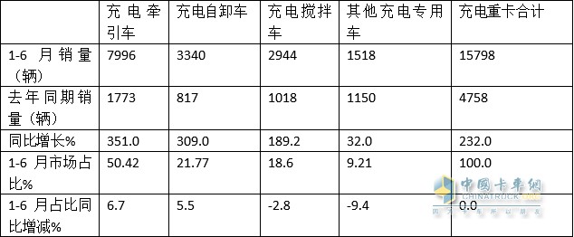 表1,2024年1-6月各類充電重卡銷量占比及占比(數(shù)據(jù)來源:終端上牌信息):