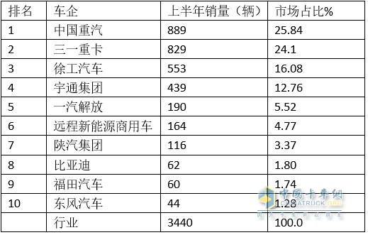 ---中國重汽累計銷售889輛,是唯二銷量超800輛的車企,累計占比25.84%,獲得第一;
