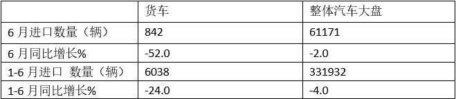上表可見,今年6月我國貨車進(jìn)口數(shù)量842輛,同比下降52%,跑輸今年6月我國貨車進(jìn)口大盤-2%的同比增速近50個(gè)百分點(diǎn);今年1-6月我國貨車?yán)塾?jì)進(jìn)口數(shù)量6038輛,同比下降24%,跑輸今年1-6月我國貨車進(jìn)口大盤-4%的同比增速近20個(gè)百分點(diǎn);