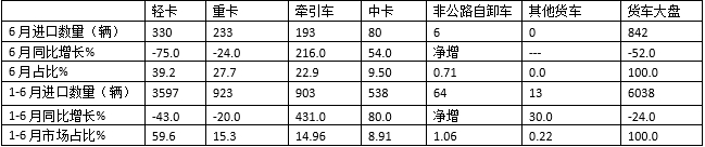 上圖表顯示,2024年6月及上半年各類貨車進(jìn)口市場中: