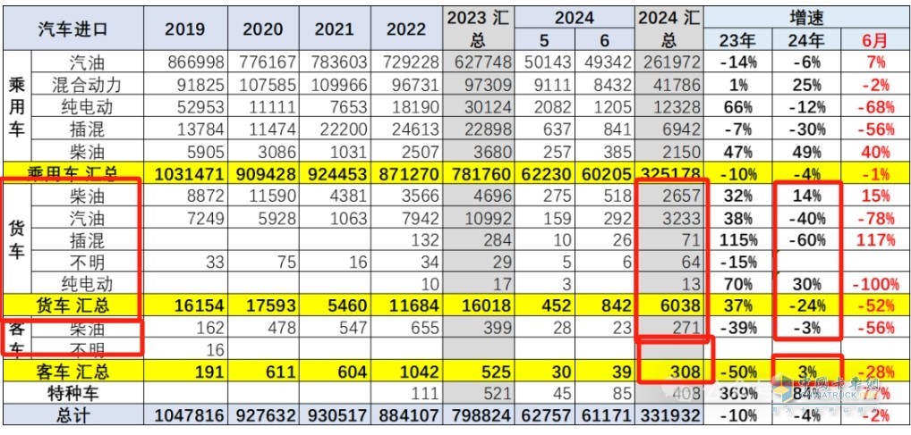 2024年1-6月我國汽車?yán)塾?jì)進(jìn)口33.2萬輛,同比下降4%,其中貨車今年上半年累計(jì)進(jìn)口6038輛,同比下降24%,也跑輸今年1-6月整個(gè)汽車進(jìn)口大盤。