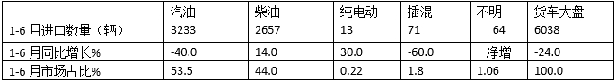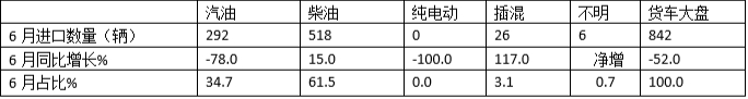 上表顯示,在2024年6月各類動(dòng)力貨車進(jìn)口市場中: