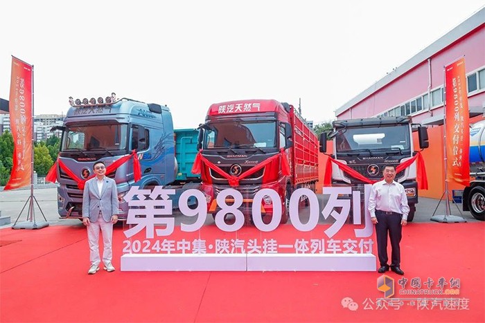 活動現(xiàn)場,陜重汽總經(jīng)理支保京和中集車輛集團(tuán)助理總裁、中集燈塔半掛車業(yè)務(wù)集團(tuán)CEO舒磊博士共同向客戶交付2024年第9800列中集·陜汽頭掛一體列車。