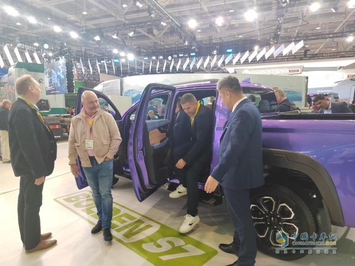德國是傳統(tǒng)的老牌汽車強(qiáng)國,也是全球高端汽車品牌的大本營,為凸顯豪華感與穩(wěn)重感,車身的美學(xué)設(shè)計(jì)多秉承穩(wěn)健內(nèi)斂的設(shè)計(jì)理念,在顏色的選擇上也以深色為主。為了給海外客戶耳目一新的感覺,本次參展的搏勝S9和搏勝S7車身顏色分別采用了極具東方特色、靚麗奪目的叢林翠和霞光紫,在一眾以黑色和白色為主的展車?yán)镒猿梢坏里L(fēng)景線。新奇特別的配色吸引了眾多海外客戶的目光,叢林翠配色的搏勝S9贏得中老年客戶、戶外活動愛好者等客戶群體的好評,而霞光紫配色的搏勝S7則頗受年輕客戶,尤其是女性客戶歡迎,有客戶評價(jià)其“第一眼就讓人心動不已,與傳統(tǒng)的汽車相比顏色非常引人注目。”在欣賞外觀之余,不少客戶進(jìn)入座艙內(nèi)試乘,對搏勝皮卡內(nèi)飾的豪華精致與乘坐舒適性也接連贊嘆。