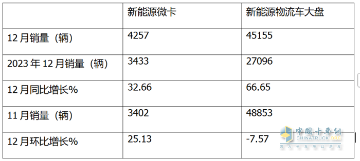 根據(jù)終端上牌數(shù)據(jù),2024年12月我國新能源卡系物流車銷量為45155輛(含新能源輕卡(含小卡)、微卡、MINI卡及中卡;不含新能源物流重卡、皮卡),同比增66.65%,環(huán)下降7.57%。其中新能源微卡銷售4257輛,同比2023年12月的3209輛(見截圖1)增長32.66%,環(huán)比2024年11月的3402輛增長25.13%。