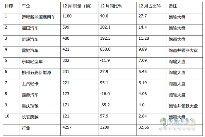特點(diǎn)三、12月:遠(yuǎn)程奪冠、福田奇瑞分列二三;雷馳汽車殺入前四并領(lǐng)漲大盤成“黑馬”
