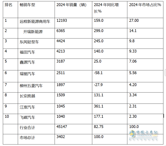 上圖表可見,在2024年12月新能源微卡銷量排行TOP10中: