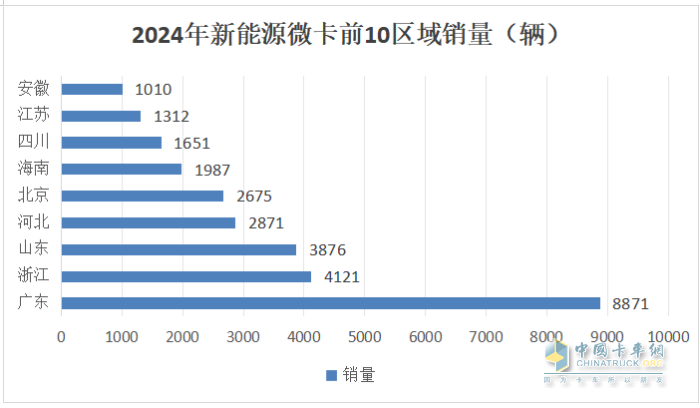 根據(jù)終端上牌信息,2024年國內(nèi)新能源微卡區(qū)域流向前10名銷量: