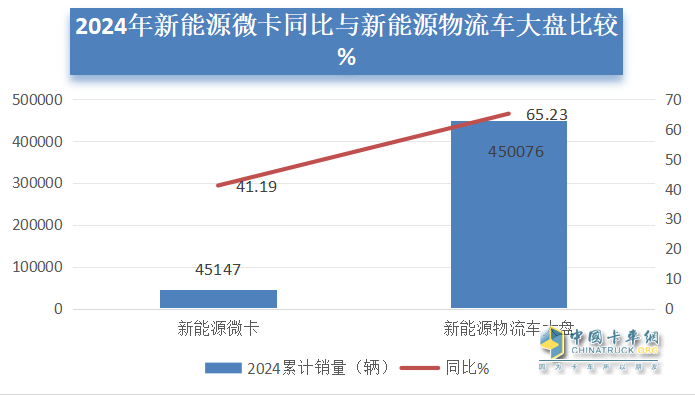 根據(jù)終端上牌數(shù)據(jù),2024年全年新能源微卡累計(jì)銷售45147輛,同比增長41.19%,跑輸2024年全年新能源物流車大盤65.23%的增速。